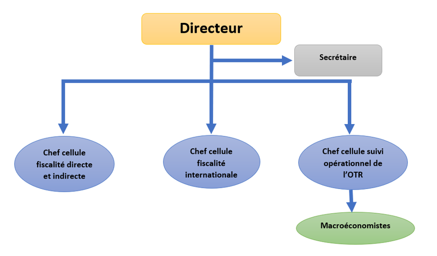 OrganigrammeAccueil — OrganigrammeDIRECTIONSecrétaireChef cellule fiscalité directe et indirecte et indirecteChef cellule fiscalité internationaleChef cellule suivi opérationnel de l’OTRMacroéconomistes
